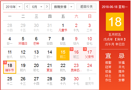 端午節要到了,根據國家統一放假安排:6月18日放假,與周末連休。