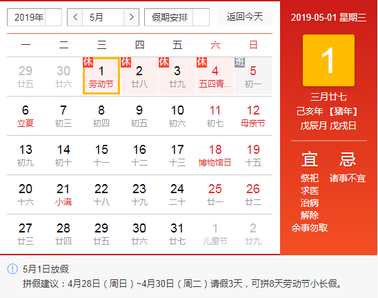 勞動節即將來臨,根據《國務院辦公廳關於調整2019年勞動節假期安排的通知》,2019年勞動節放假安排調整為2019年5月1日至4日,共4天。4月28日(星期日)、5月5日(星期日)上班。