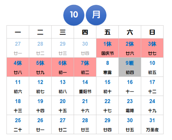 2021年10月1日(星期五)至10月7日(星期四)放假調休,共7天,