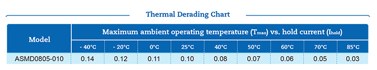 必威betway网址0805封裝貼片自恢複保險絲對應係列為ASMD0805係列,該係列提供微型表麵貼裝可複位過流保護,保持電流範圍為50mA至1.5A。該係列適用於空間有限且器件電流低的超便攜應用。必威betway网址0805封裝0.1A 60V貼片自恢複保險絲對應型號為ASMD0805-010-60V,絲印為“1”,保持電流0.1A,最大電壓60V,最大電流40A,動作電流0.25A,功耗為0.5W,最小內阻為1Ω,上機一小時後最大內阻為9Ω,正常工作溫度範圍為 -40 °C~+85 °C,工程師在進行保險絲選型時,需要注意板子工作環境溫度的影響,保險絲在不同工作環境溫度下額定電流及動作電流都會有折減,ASMD0805-010-60V工作環境溫度對額定電流的影響如下表所示: