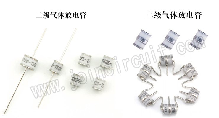 從外觀上來說:有帶引線和不帶引線兩種。二級氣體放電管不帶引線和三級氣體放電管不帶引線的差別很明顯,三級放電管中間有一個很明顯的分界線,二級沒有;同樣的,帶引線的差別也很明顯。二級帶引線放電管有兩根引線,三級放電管有三根引線。
