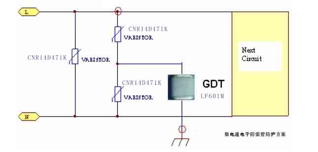 下圖是氣體放電管和壓敏電阻組合構成的浪湧抑製電路。由於壓敏電阻有一致命缺點:具有不穩定的漏電流,性能較差的壓敏電阻使用一段時間後,因漏電流變大可能會發熱自爆。為解決這一問題在壓敏電阻之間串入氣體放電管。在這種串聯組合支路中,氣體放電管起一個開關作用,當沒有暫態過電壓作用時,它能將壓敏電阻與係統隔離開,使壓敏電阻中幾乎無泄漏電流,從而有效地減緩壓敏電阻性能衰退。(推薦閱讀:10KA三級防雷管帶引腳6*8.5mm係列氣體放電管JTA36H)