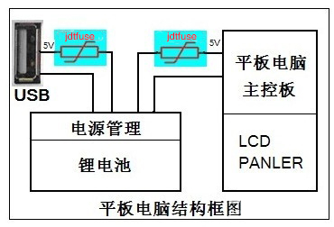 b) jdtfuse用於控製電路輸出與USB接口的5V電源線上,主要是為了避免USB負載短路使平板電腦的控製電路燒壞、同時也避免誤輸入灌電流使平板電腦內部電路燒壞。